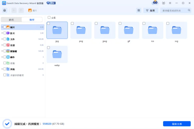 能找回清空資源回收桶或直接刪除的 JPG、JPEG、PNG、GIF 等各種照片格式檔案。