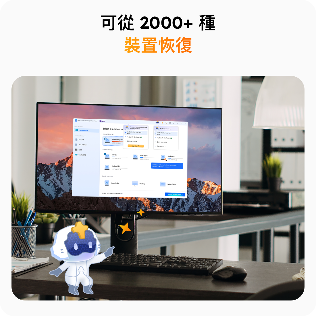 EaseUS Data Recovery Wizard 會在您 NAS 和 Linx 復原過程中的每一步為您提供支援。從 SD 卡到外接硬碟或網路儲存,我們的軟體讓資料救援變得簡單,讓您安心地恢復遺失的檔案。